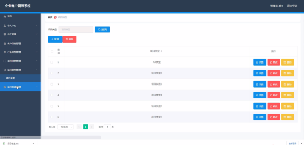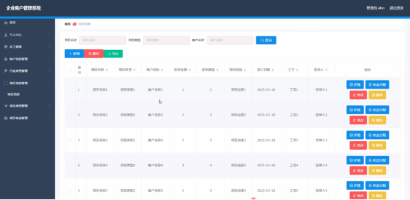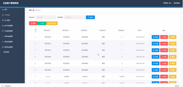 管理员登录进入企业客户管理系统可以查看首页、个人中心、员工管理、客户信息管理、行业类型管理、项目信息管理、项目类型管理、项目收益管理等信息。