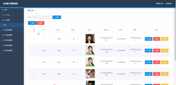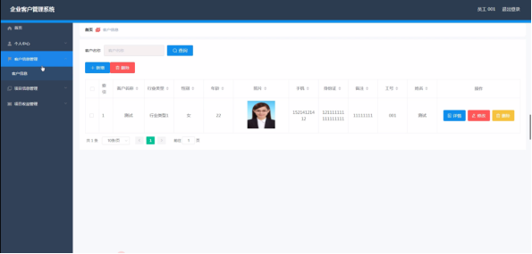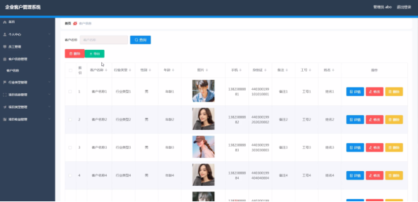 客户信息管理,在客户信息管理页面中通过填写客户名称、行业类型、性别、年龄、照片、手机、身份证、备注、工号、姓名等信息内容,并且根据需要对已有客户信息管理进行详情、修改、删除等其他详细操作,如图5-11所示。