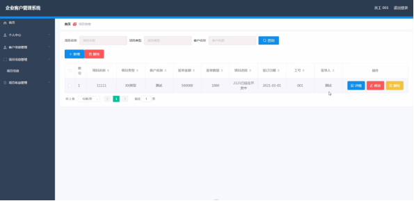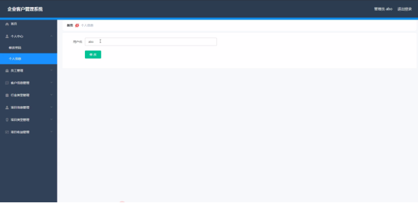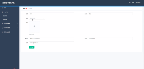 员工登录进入企业客户管理系统可以查看首页、个人中心、客户信息管理、项目信息管理、项目收益管理等内容。