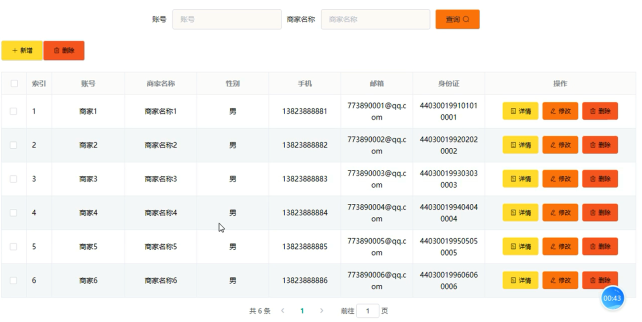 管理员可增删改查商家信息,商家管理界面展示如图5-9所示 。
