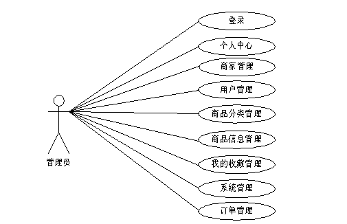 (2)管理员:管理员登录后可对系统进行全面的管理,主要功能模块包括个人中心、用户管理、商家管理、商品分类管理、商品信息管理、我的收藏管理、系统管理以及订单管理。管理员用例图如图3-2所示。