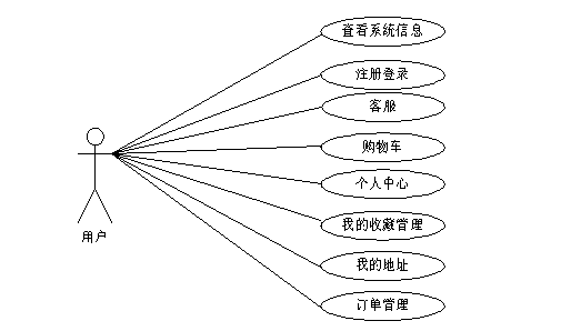 (1)用户:用户在系统前台可查看系统信息,包括首页、商品信息等,注册登录后主要功能模块包括购物车、个人中心、我的地址、我的收藏管理以及订单管理,用例图如图3-1所示。