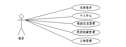 (3)商家:商家注册登录后主要功能模块包括个人中心、商品信息管理、我的收藏管理以及订单管理。商家用例图如图3-3所示。