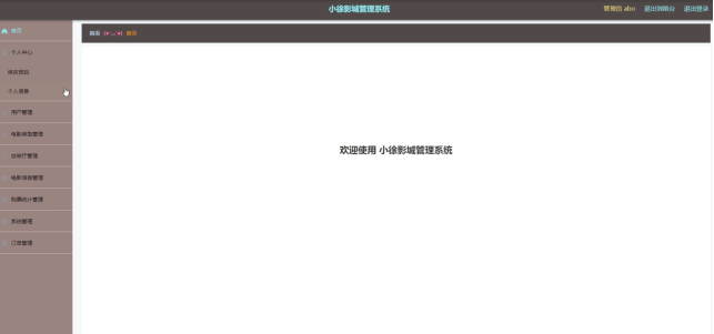 管理员通过后台管理,进入页面可以获取首页、个人中心、用户管理、电影类型管理、放映厅管理、电影信息管理、购票统计管理、系统管理、订单管理等功能模块内容,如图5-2所示。