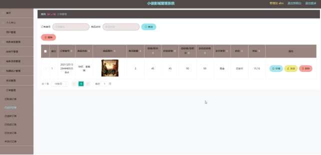 订单管理,在订单管理页面通过查看订单编号、商品名称、商品图片、购买数量、价格/积分、折扣价格、总价格/总积分、折扣总价格、支付类型、状态、地址等信息进行详情、发货、删除操作。如图5-10所示。