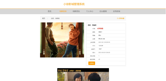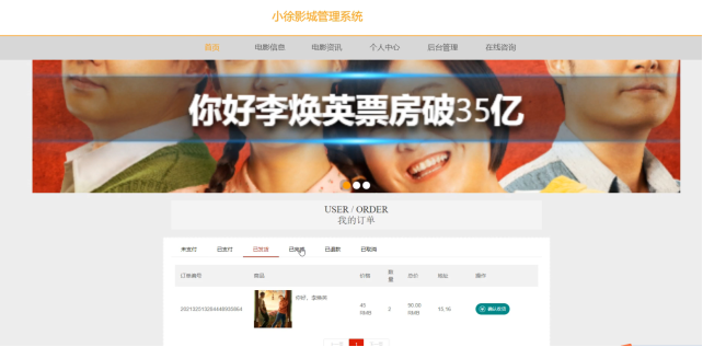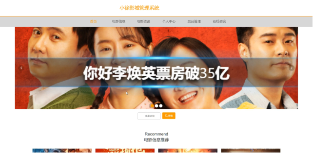 小徐影城管理系统,在前台首页可以查看首页、电影信息、电影资讯、个人中心、后台管理、在线客服等内容,如图5-11所示。