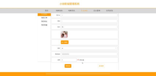 个人中心,在个人中心页面中可以填写用户名、密码、姓名、头像、性别、联系电话、余额等信息进行点我充值、更新信息、退出登录操作,如图5-14所示。