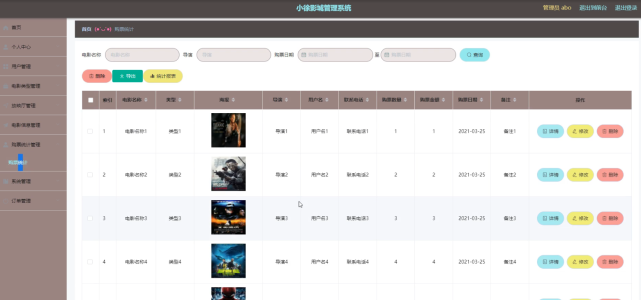 购票统计管理,在购票统计管理页面通过查看电影名称、类型、海报、导演、用户名、联系电话、购票数量、购票金额、购票日期、备注等信息进行详情、删除、修改操作。如图5-7所示。
