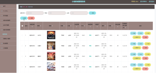电影信息管理,在电影信息管理页面通过查看电影名称、类型、海报、导演、主演、上映日期、片长、电影预告、放映厅、场次、价格、座位总数、已选座位等信息进行详情、统计、查看评论、删除、修改操作。如图5-6所示。