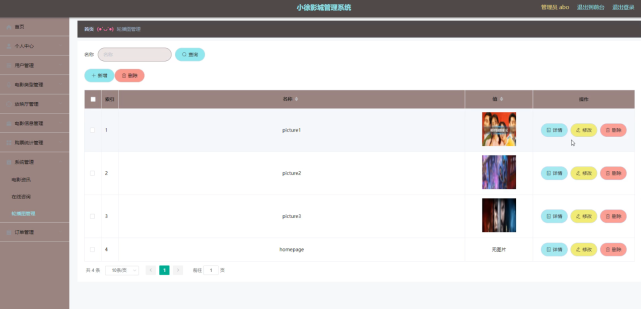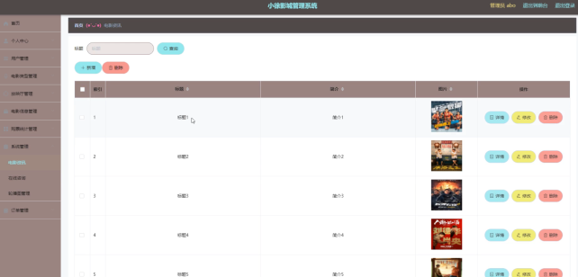 电影资讯,在电影资讯页面通过查看标题、简介、图片等信息进行详情、删除、修改操作。如图5-8所示。
