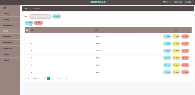 电影类型管理,在电影类型管理页面通过查看类型等信息进行详情、删除、修改操作。如图5-4所示。
