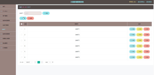 放映厅管理,在放映厅管理页面通过查看放映厅等信息进行详情、删除、修改操作。如图5-5所示。