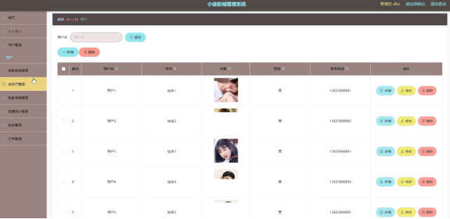用户管理,在用户管理页面通过查看用户名、姓名、头像、性别、联系电话等信息并进行详情、删除、修改操作,如图5-3所示。