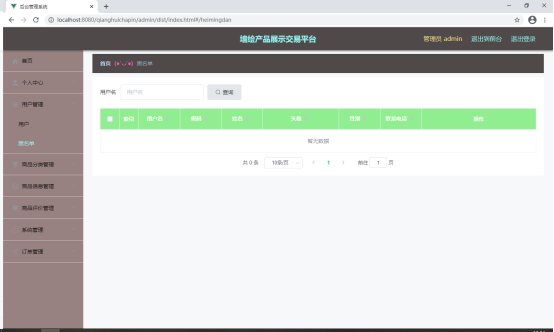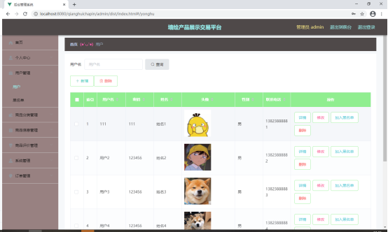 如图5.1显示的就是用户信息管理页面,此页面提供给管理员的功能有:用户信息的查询管理,可以删除用户信息、修改用户信息、新增用户、将用户加入黑名单或取消信息,