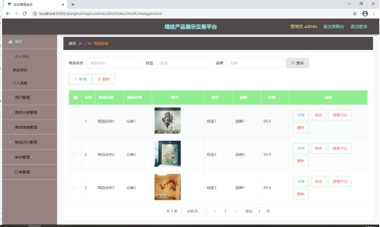 如图5.2显示的就是商品信息管理页面,此页面提供给管理员的功能有:查看已发布的商品信息数据,修改商品信息,商品信息作废,即可删除。
