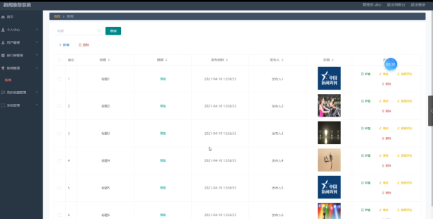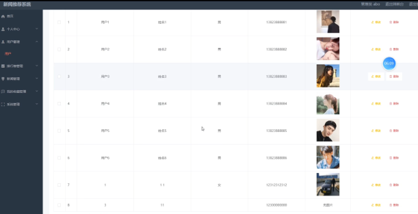 新闻推荐系统的系统管理员可以可以对用户信息添加修改删除操作。具体界面的展示如图5.1所示。