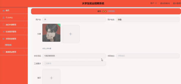 大学生就业招聘系统的用户可以管理自己的求职信息,可以对自己的求职信息添加修改删除操作。具体界面的展示如图5.1所示。