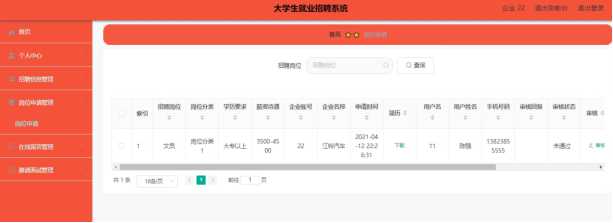 企业用户登录后可以在岗位申请管理查看其他用户申请的岗位,并且可以对岗位申请信息进行审核操作。界面如下图所示: