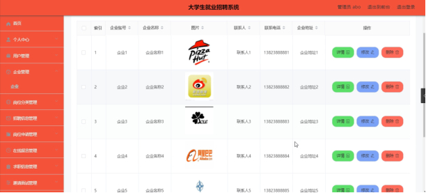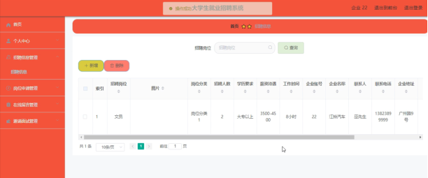 企业用户可以自己新增招聘信息,并可以对自己新增的招聘信息进行修改删除操作。界面如下图所示: