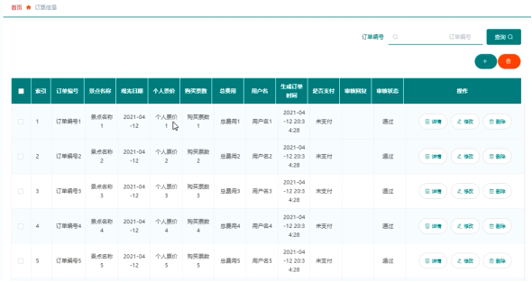 管理员可查看所有订票信息,并可的前进行修改和删除操作,订票信息管理界面展示如图5.4所示。
