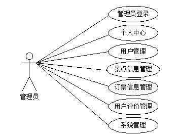 管理员是这两类用户中权限最高的,管理员登录后可对系统进行全面管理,确保系统正常稳定运行,管理员主要功能包括个人中心、用户管理、景点信息管理、订票信息管理、用户评价管理以及系统管理。管理员用例图如图3.1所示。