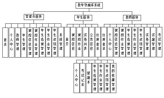 此教学资源库系统的设计与实现功能分析主要分为管理员功能模块、教师功能模块和学生功能模块三大模块,下面详细介绍这三大模块的主要功能: