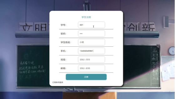 没有账号的学生可进行注册操作,学生注册界面展示如图5-2所示。