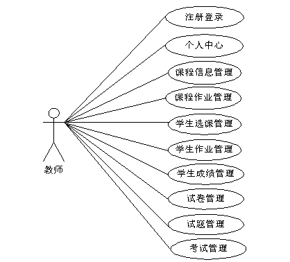 (3)教师:教师注册登录后主要实现的功能模块包括个人中心、课程信息管理、课程作业管理、学生选课管理、学生作业管理、学生成绩管理、试卷管理、试题管理、考试管理。
