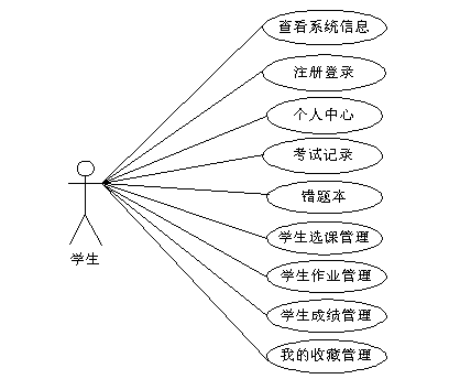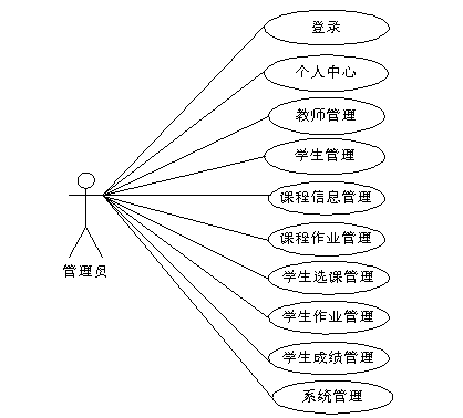 (1)管理员:管理员登陆后可对系统进行全面管理,管理员主要功能模块包括个人中心、教师管理、学生管理、课程信息管理、课程作业管理、学生选课管理、学生作业管理、学生成绩管理、系统管理,管理员实现了对系统信息的查看、添加、修改和删除的功能。管理员用例图如图3-1所示。
