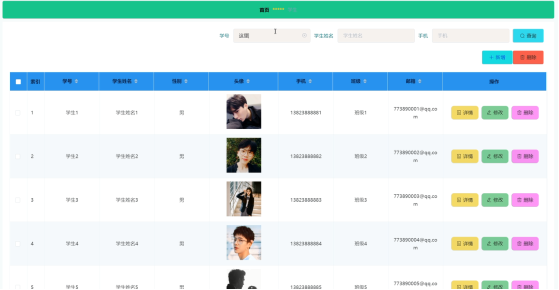 管理在学生管理界面可查看所有学生信息,并可对其进行修改和删除操作,学生管理界面展示如图5-8所示。