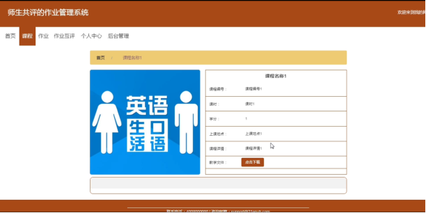 师生共评的作业管理系统的学生可以在前台首页查看课程信息,并且可以下载操作。具体界面的展示如图5.1所示。