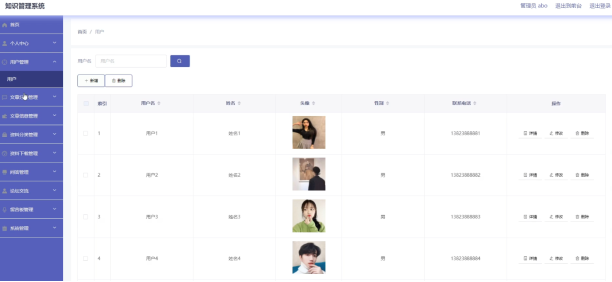 知识管理系统的管理员可以对用户新增,修改,删除,查询操作。具体界面的展示如图5.1所示。