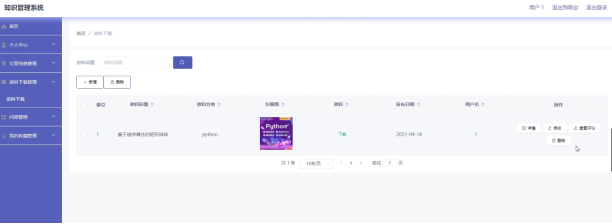 用户登录后在后台管理可以对资料进行添加修改删除操作,并可以查看下载信息和评论信息。界面如下图所示: