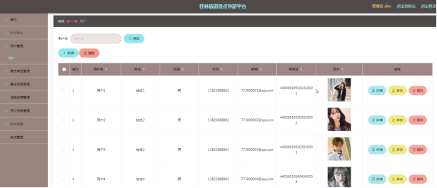 桂林旅游景点导游平台的系统管理员可以管理用户,可以对用户信息添加修改删除以及查询操作。具体界面的展示如图5.1所示。