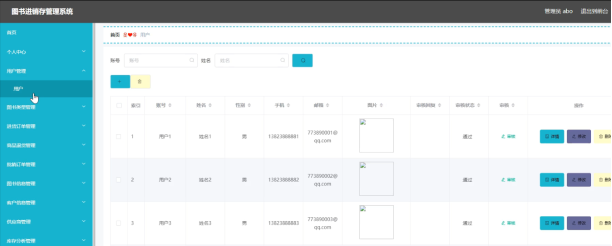 图书进销存管理系统的系统管理员可以管理用户,可以对用户信息添加修改删除以及查询操作。具体界面的展示如图5.1所示。