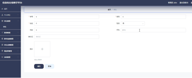 信息化在线教学平台的系统管理员可以管理学生信息检,可以对学生信息信息添加修改删除以及查询操作。具体界面的展示如图5.1所示。