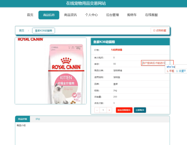 用户可以在前台看到商品信息,可以对商品信息进行收藏,购买,评论。界面如下图所示: