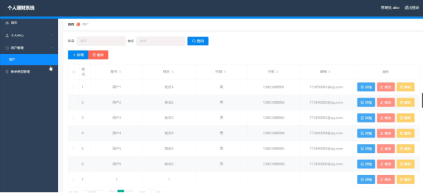 个人理财系统的系统管理员可以管理用户信息,可以对用户信息信息添加修改删除以及查询操作。具体界面的展示如图5.1所示。