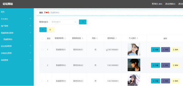系统管理员可以查看对普通管理员信息进行添加,修改,删除以及查询操作。具体界面如图5.2所示。