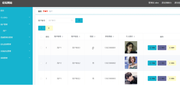 论坛网站的系统管理员可以管理用户,可以对用户信息添加修改删除以及查询操作。具体界面的展示如图5.1所示。