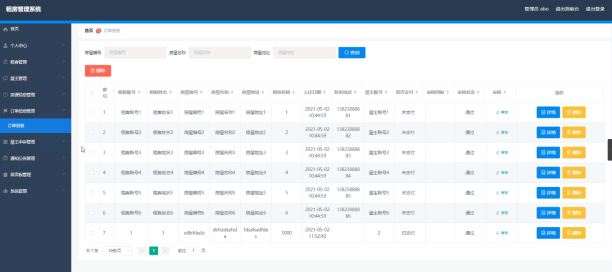 租房管理系统的系统管理员可以管理订单,可以对订单信息审核,删除以及查询操作。具体界面的展示如图5.1所示。