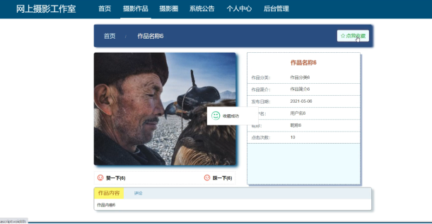 用户登录后可以对摄影作品进行收藏操作。界面如下图所示:
