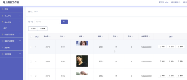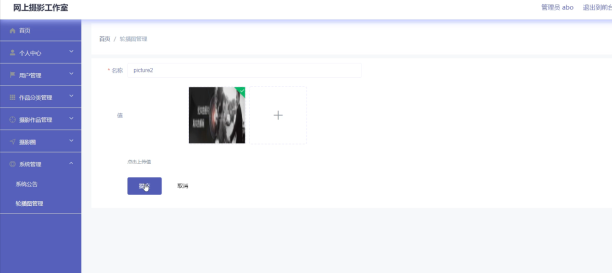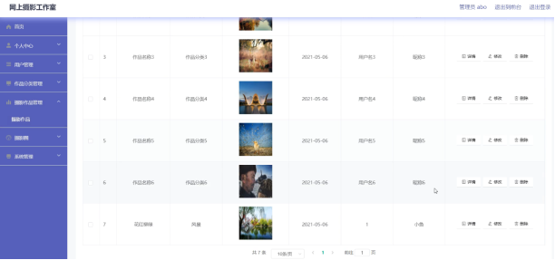 系统管理员可以对用户提交的摄影作品进行添加修改删除操作。界面如下图所示:
