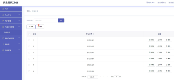 系统管理员可以查看对作品分类进行添加,修改,删除以及查询操作。具体界面如图5.2所示。