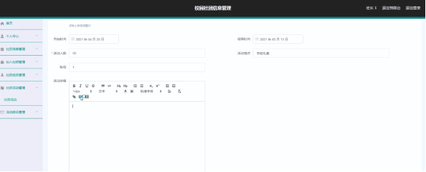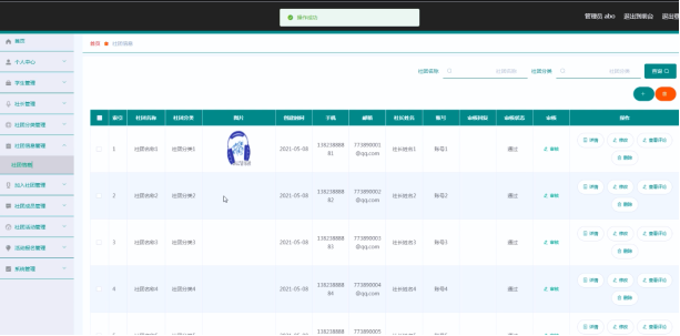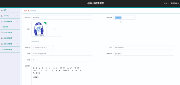 系统管理员可以对社团信息进行添加修改删除操作。界面如下图所示: