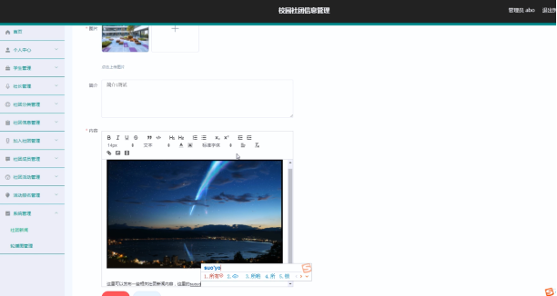 系统管理员可以对社团新闻进行添加修改删操作。界面如下图所示: