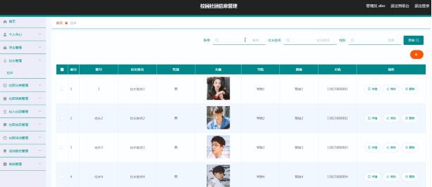 系统管理员可以查看对社长信息进行修改,删除以及查询操作。具体界面如图5.2所示。