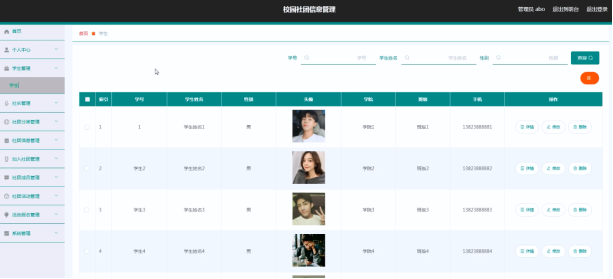 校园社团信息管理系统的系统管理员可以管理学生,可以对学生信息修改删除以及查询操作。具体界面的展示如图5.1所示。