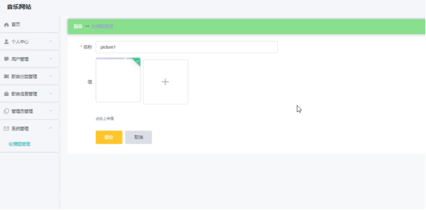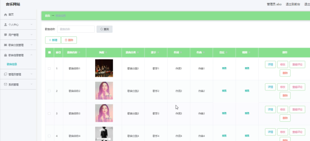 系统管理员可以对歌曲信息进行添加,修改,删除以及查询操作。界面如下图所示: