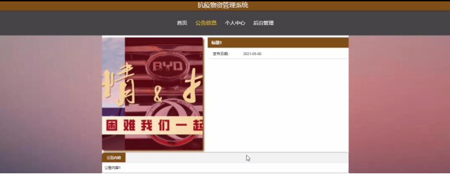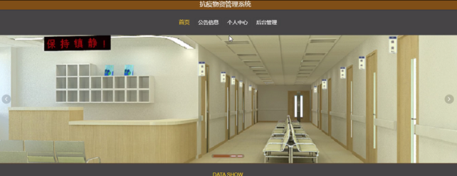 抗疫物资管理系统,在系统首页可以查看首页、公告信息、个人中心、后台管理等内容,如图5-11所示。